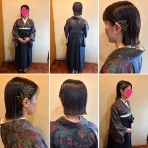 ブラントボブでいつもは真っ直ぐおろしているのですが、お辞儀が多い式では髪の毛が落ちるの気になるのでゴールドピンを使ってしっかり固定しながらも、オシャレで着物に似合うよう粋な感じでちょっと外はね感も出して仕上げてみました
